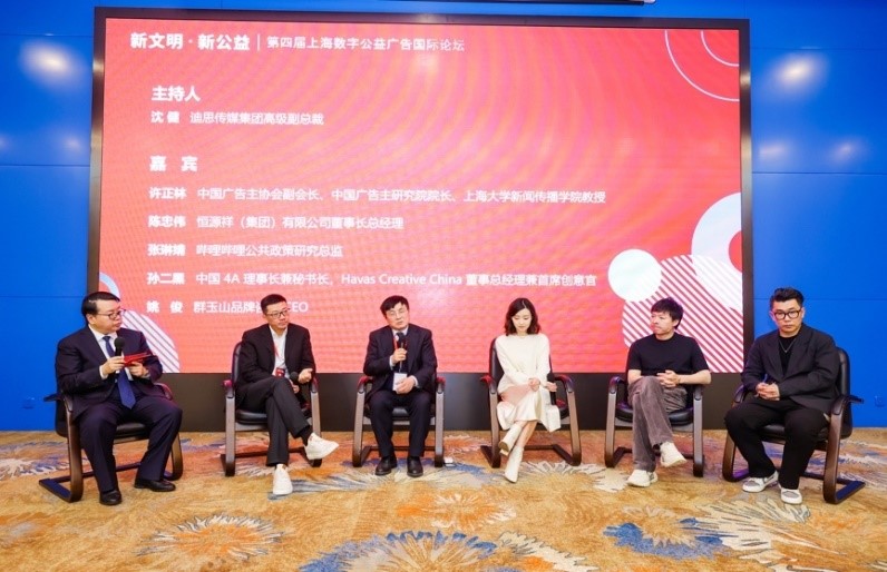 在主旨演讲结束后,迪思传媒集团高级副总裁沈健主持了圆桌论坛环节。中国广告主协会副会长、中国广告主研究院院长、上海大学新闻传播学院许正林教授,恒源祥(集团)有限公司董事长兼总经理陈忠伟,哔哩哔哩公共政策研究总监张琳婧女士,中国4A理事长兼秘书长、Havas Creative China董事总经理兼首席创意官孙二黑,群玉山品牌咨询CEO姚俊作为圆桌嘉宾,围绕数字时代公益传播的价值内涵、运行机制和管理规范等议题展开思维碰撞,引得现场掌声不断。